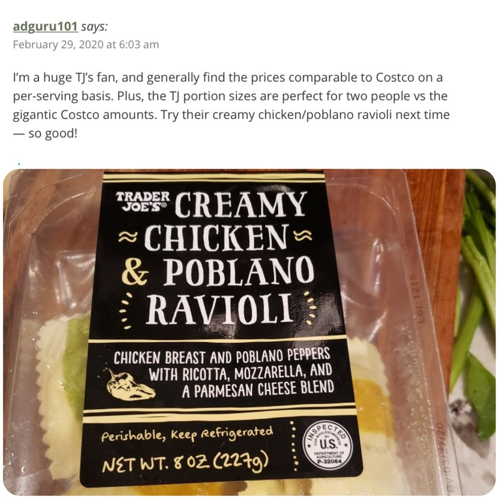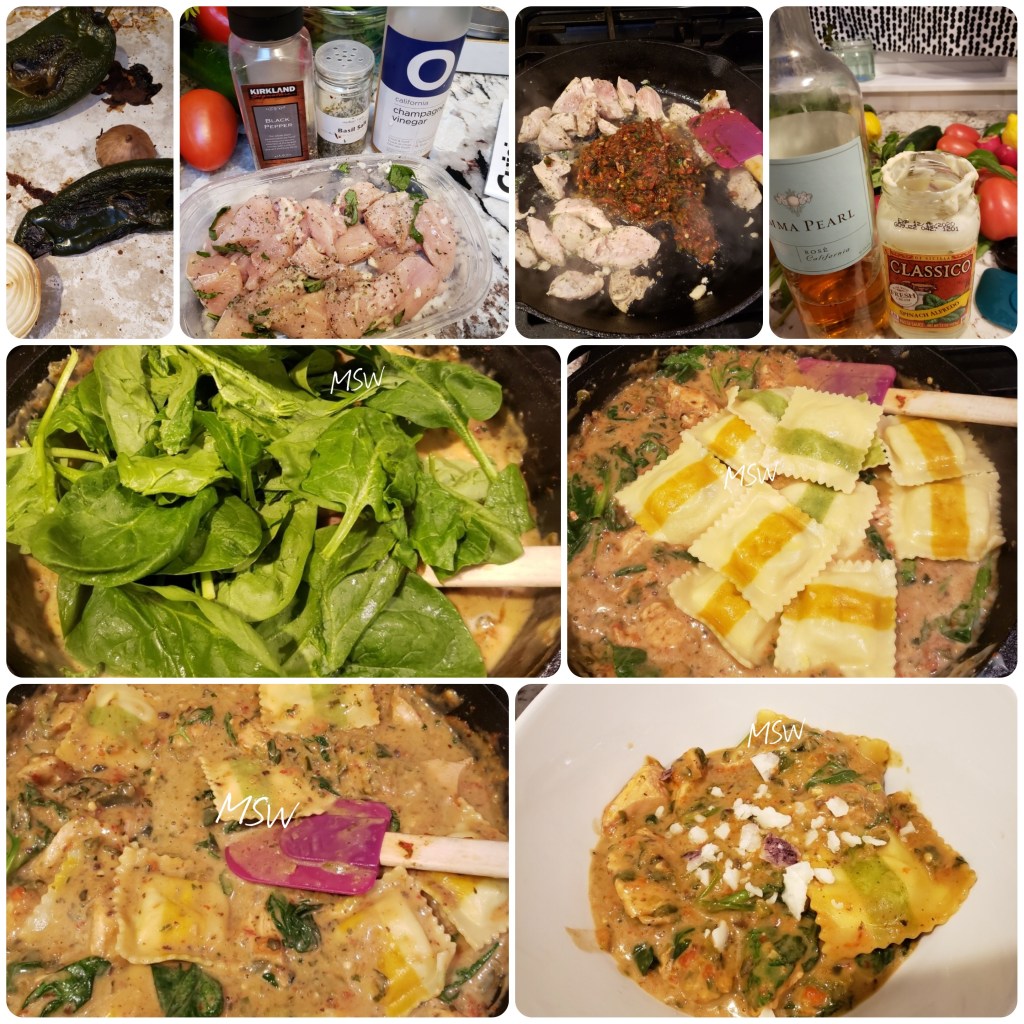 Chicken Poblano Ravioli: Earlier this year I reposted a recipe titled Baked Goat Cheese Sundried Tomato ravioli. A dear reader informed me that I needed to try Trader Joes creamy chicken/poblano ravioli because it was “so good”. I finally found it in at Trader Joes, but of course it did not come with a sauce, so I whipped one up. Bon Appetit.