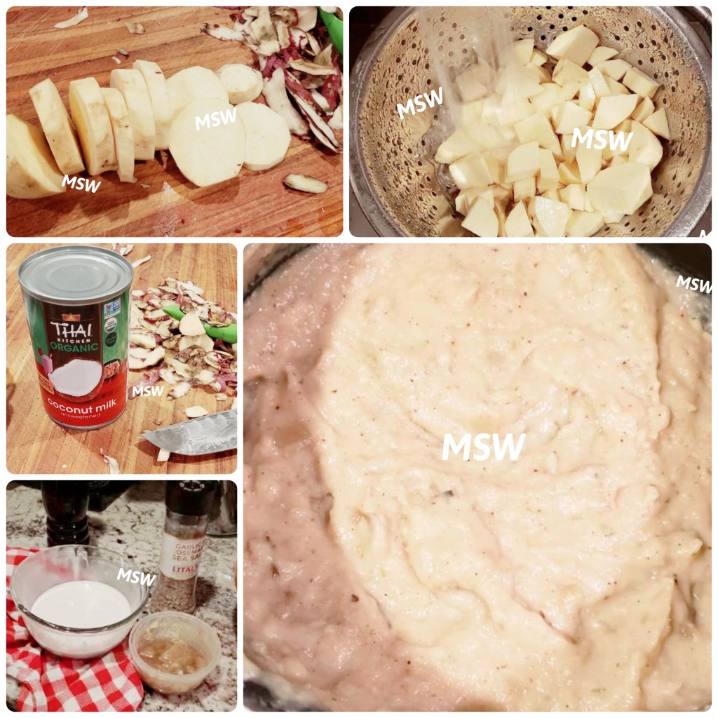 Receiving my new pantry box, I saw there sat two Japanese sweet potatoes. Right away I knew despite the shape and size these were no ordinary sweet potatoes. Their skins were a burgundy complexion, leaving me to wonder how else they differed. I Googled and learned the following: “Japanese sweet potatoes have a much sweeter taste than ordinary sweet potato varieties found in the US. They have a nutty flavor reminiscent of roasted chestnuts. The texture is drier, firmer, and starchier, and its concentrated sweetness makes them an ideal ingredient for making desserts.” I rolled my eyes at the word “desserts”. If you’ve been following my culinary adventures, you know I do not bake. This left me thinking about what to do with the Japanese sweet potatoes. I Googled “Top Japanese Sweet potatoes recipes,” and landed on mashed potatoes (yes, so American!). I skimmed the recipe and thought “got it!” Please note, I only used this recipe as inspiration. I added a homemade roasted garlic au ju sauce(instead of stock), which I had in the fridge from earlier in the week, rosemary garlic seasoning, and fresh ground pepper.