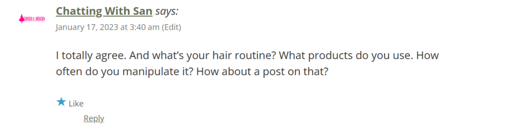 This is a beautiful picture. I remember when Momma use to put my hair in big pony tails like that. Oh the memories. I think I manipulate my hair too much. I only wash my hair once a week, period. But I think its the two strand twice and taking it down and put it back up that I do too much with. I’m forever trying to new products as well, just like now I’m using Donna, from Tabitha Brown. The products do smell good but other than that I don’t know if I can see a difference anything. But after my scare with Alopecia last year, I believe I’m too afraid to do anything with it. I know Jesus hasn’t given us a spirit of fear but I hated being bald headed last year. I just a picture of me from last year and I looked like an ugly little boy. I think I eluded that feeling too. So, I’m just grateful for some hair on today. Lol! But thanks so much for sharing your items and routine. I’m encouraged! I’ve only been natural since 2008. But I have no desire to go back to a perm. However, I wish I could get some knotless braids. Good morning!