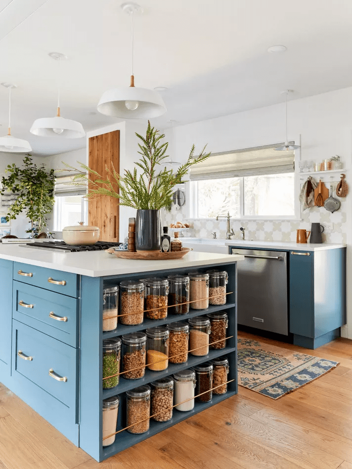 If you don’t have space for a walk-in pantry, there’s no need to fret. With some effort and imagination, you can build shelves onto the side of your kitchen island, creating a small-scale pantry that can hold all kinds of snacks and necessities.