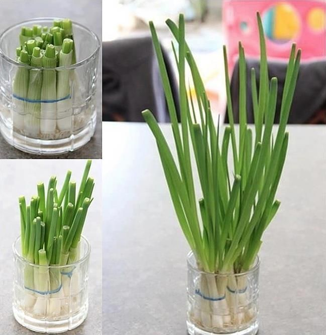 Place onions, roots down, in a small water-filled glass, and set in a sunny spot. Replace the water every 2 to 3 days; transfer to a pot if you’d like the onions to last longer. New growth should be ready to harvest after 7 days.
