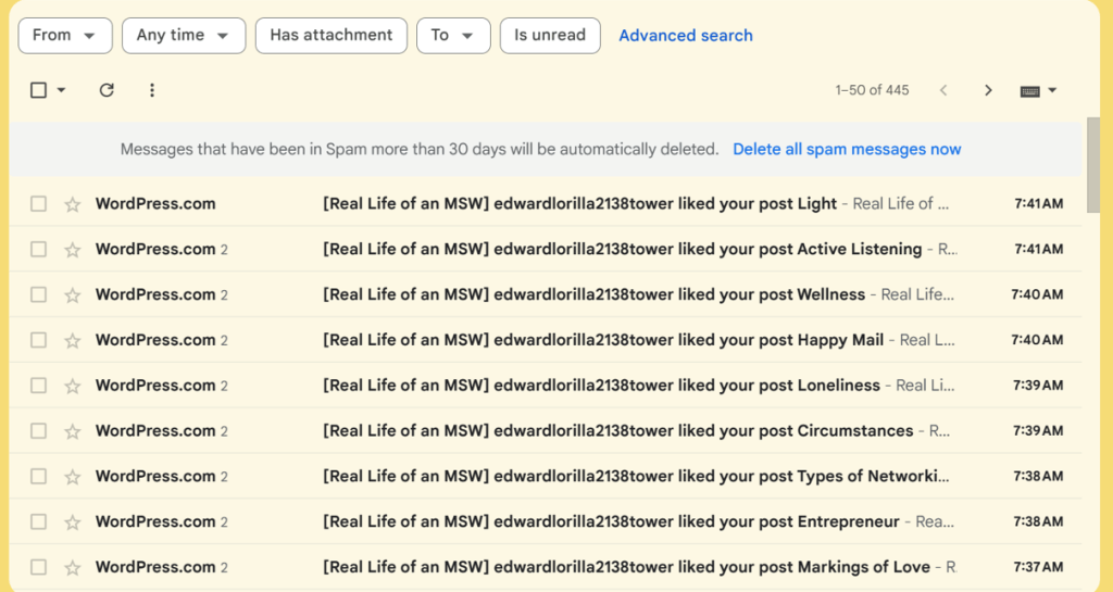 WordPress, I came to enjoy the platform, and don’t mind paying a small fee to not have advertisements. The money makes me show up, post, and communicate with fellow readers and bloggers, but in the last several months something has stood out to me. A reader by the name of edwardlorilla2138tower has “liked” hundreds of posts in a matter of minutes. I do not see a WordPress icon for edwardlorilla2138tower on any of these posts. Nor do I see a link saying you can view their page. This is normal because not everybody has a page or maybe their page is private. However, I have to say, edwardlorilla2138tower ‘s constant blast of emails is irksome. I tried blocking edwardlorilla2138tower , to no avail. I learned WordPress does not block this individual email’s, but blocks everyone’s email because everyone who likes a post has the following email donotreply@wordpress.com. I appreciate this feature as we all deserve to remain anonymous if we like and not to have overwhelming inboxes. Next, I tried marking edwardlorilla2138tower as spam, because I truly feel like if someone likes a hundred plus posts in a matter of minutes it’s spam. This worked for a while. Then edwardlorilla2138tower came back, vigorously. I marked him as phishing because really, what does this person want? I also wonder if this is a WordPress thing because after each “attacks” I always get an email saying I am near my limit, and I may need to upgrade. I have outreached to WordPress and have not received an answer on this matter. If they want me to upgrade, they need to find a better way to go about this. Has anyone else had any similar issues with WordPress? How did you fix them? Has anyone had encounters with edwardlorilla2138tower ? Does anyone have any other gripes about this platform? I have a few— like why my Instagram plug in doesn’t work, but let’s save that rant for another day.