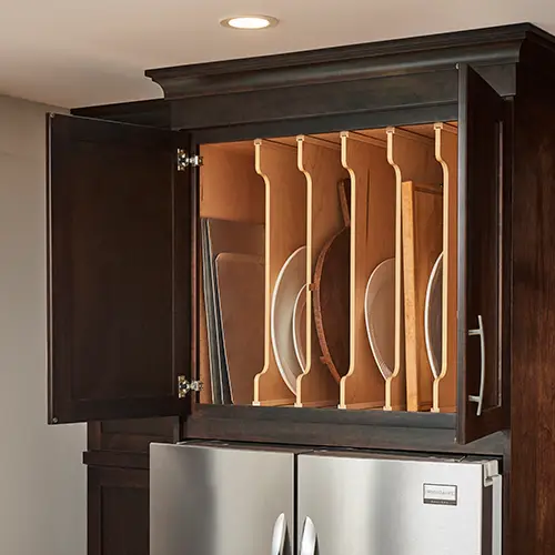 Divide and conquer! Tray dividers are simple yet effective ways to organize cutting boards, pizza pans and baking sheets. They’ll work well in base cabinets, pantry cabinets or any deep upper cabinet spaces.