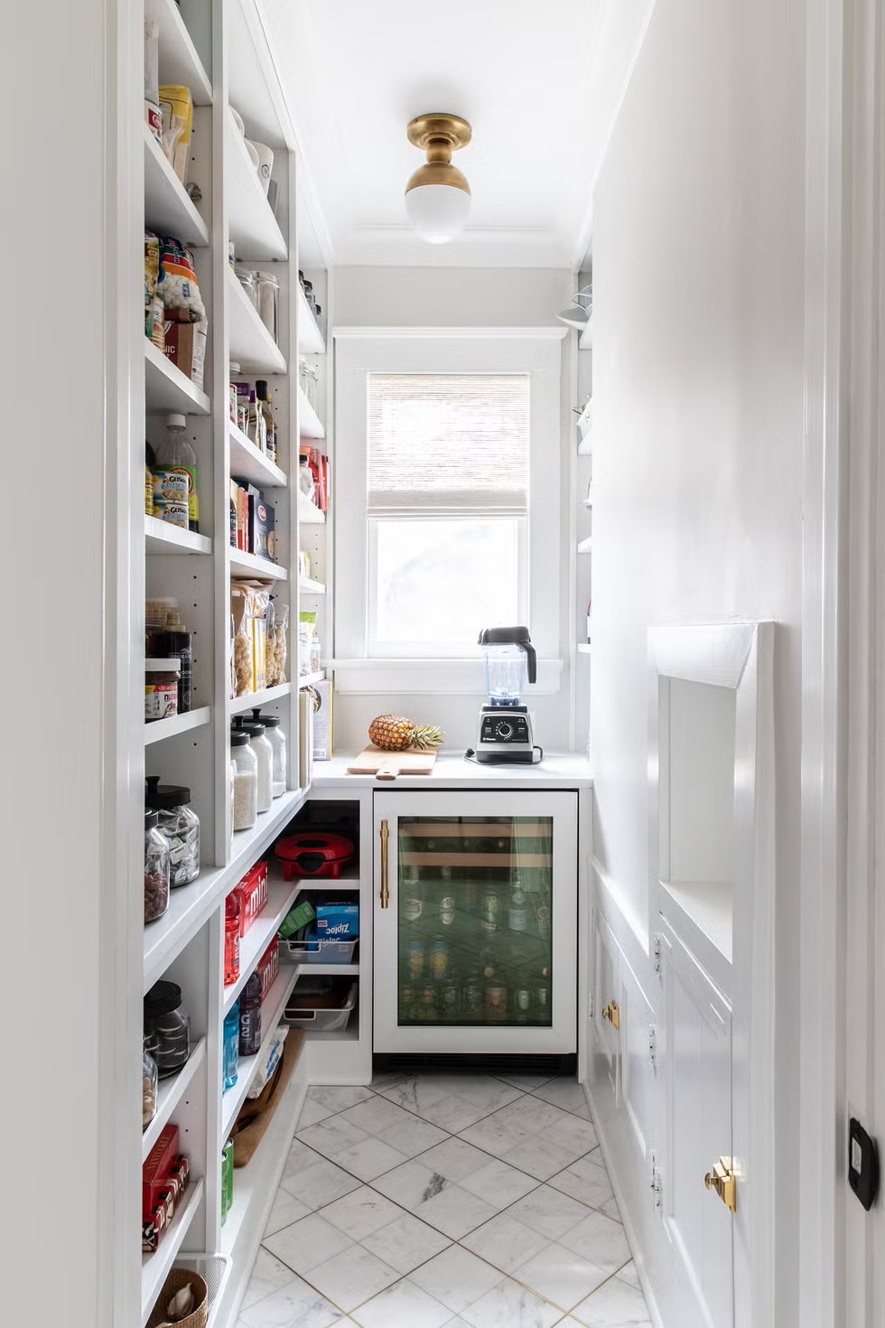 Take shelving all the way to the ceiling, storing infrequently used appliances, tools and ingredients up top, just as designer Kate Markerdoes here. Just don’t forget to keep a stepping stool handy.