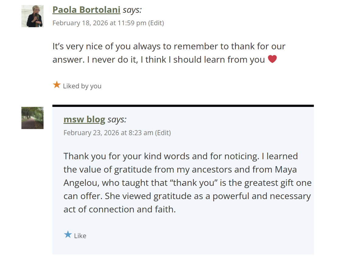 I recently received a message that reminded me how meaningful it is to express appreciation. I let myself sit with how nice it is to be able to express appreciation. It is so nice to be able to say, “Thank you,” to people. It feels rich in the body.